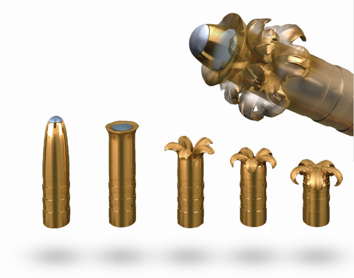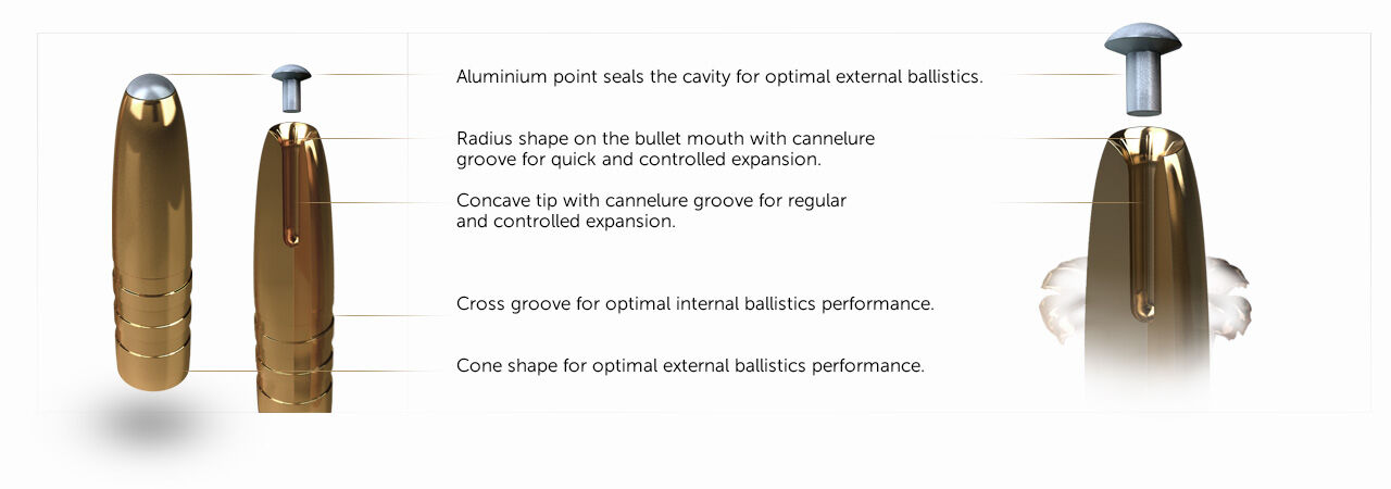 Führungsrillen optimieren die Innenballistik und schonen den Lauf. Kupferhohlspitzgeschoss mit Aluminiumspitze und konusförmige Außenform. Die Hohlspitze wird mit einer Aluminiumhaube verschlossen, die als Deformations-Starter dient. Innen sind Sollbruchstellen integriert, um den Aufpilzvorgang zu beschleunigen und kontrolliert ablaufen zu lassen. Führungsbänder vermindern den Einpresswiderstand in den Lauf.