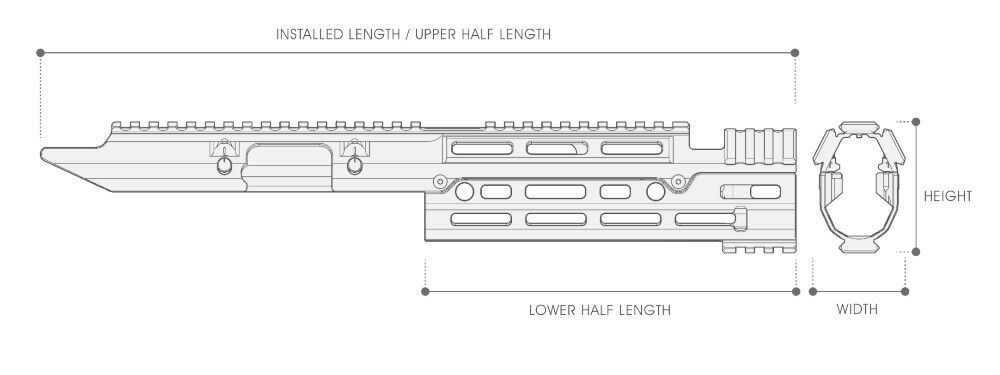 - M-LOK-Steckplätze: Oben: 4 / Seitlich: je 6 volle und 2 halbe / Unten: 3 volle und 1 halber