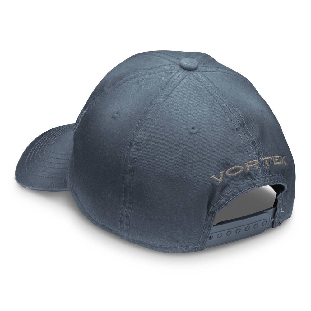 Schicke Baumwoll-Cap von Vortex in navy Blau oder Beige/Braun im Used-Look, mit Vortex-Logo auf der Front und Schriftzug über dem verstellbaren Verschluss.